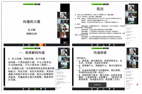 阳春三月,春暖花开,在举国上下防疫、抗疫的特殊时期,我院2019级MEM1202班迎来了新学期的第一门课程。3月18日晚7点,授课老师张亚莉副教授和班上56位同学如期进入瞩目视频课堂,开始了《管理沟通》课程的线上教学。